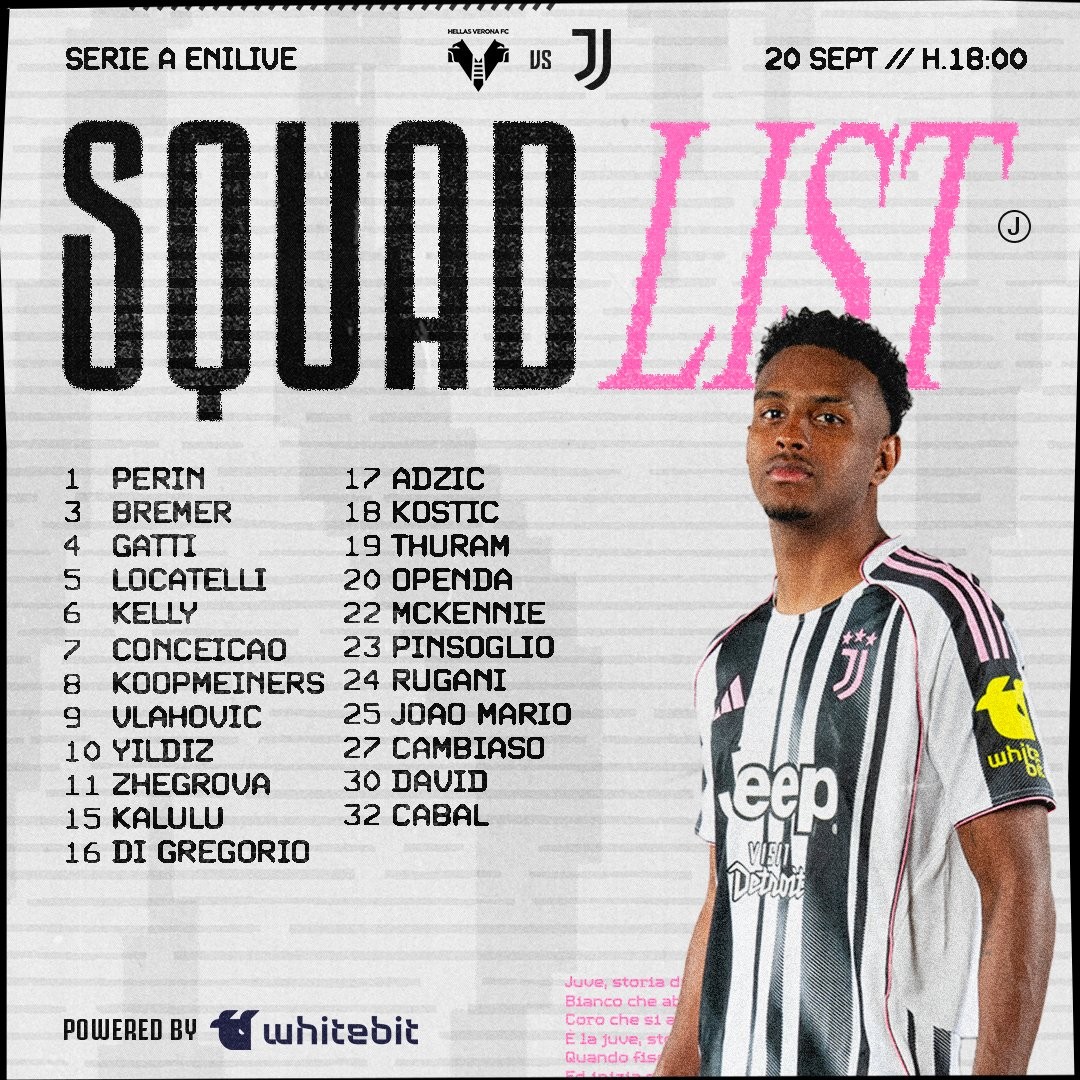 北京时间9月19日,前3轮全胜的尤文图斯公布了意甲第4轮他们客战维罗纳的比赛大名单。